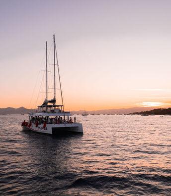 Departing from Marina Baie des Anges, step aboard our maxi-catamaran Mayba for an unforgettable dinner cruise, set to a sublime sunset, a festive onboard atmosphere, and one of the most spectacular fireworks displays in the Mediterranean.